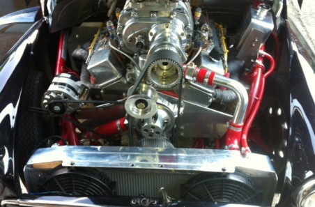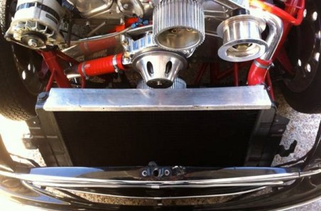 The beast now houses a super charged Chevy small block engine with over 5 times the original cubic capacity of the car in standard form! As you can imagine things get rather hot under the bonnet and there is not a great deal of room for the water radiator. We built the biggest possible unit to the customers cardboard template, a method that works really well as the customer can fit the mock up in the car before we fabricate the finished part. Due to the unconventional shape of the cooler we put baffles inside to force the water through the cooler times (otherwise known as a triple pass cooler).